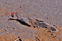 The large squirrel was very furry, with white and light gray fur, or at least what was left of it. The head was absolutely destroyed and its body appeared flat like a pancake! Found in the middle of Mt. Baldy Rd, this roadkill must've made a good meal for some scavengers in the Lower Montane Forest.