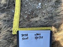FINAL ENTRY FOR NBG4 SURVEY ON 2/21/25. END 1550, CLR 72F, WIND LT FROM EAST. COMMENTS, NO BOBCAT SIGN, SOME COYOTE TRACKS, THE ONLY BTJR SIGN FOUND WAS AT LOWER ELEVATION AREA AT THE SOUTH BASE OF THE HILLS. HIGH K-RAT POPULATION THROUGHOUT, KIT FOX SIGN, GTR. RR, D. WOOD-RAT, POCKET MICE, ALSO FOUND THROUGHOUT. THE AREA COVERED.