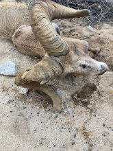 Adult ram class 4 was hit by car. I received a call this afternoon from Cody Ambrose the Senior Park Ranger at the Agua Caliente County Park. A customer there had reported this ram on the side of the road. Cody went to site and took the photos and location. He was able to drag the ram off the road and behind “a large bush”, but couldn’t move it to a location further off the road.