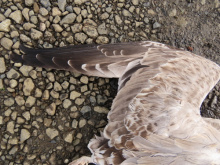 This juvenile gull was lying at the edge of the road, so roadkill seems likely. However, traffic move slowly here. If it was killed by a vehicle, there's a reason it was (starvation? injuriy? social interactions?).