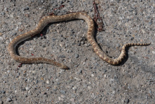 Roadkilled? (found upside down on road) gopher snake, moved to side of the road for scavenger safety.