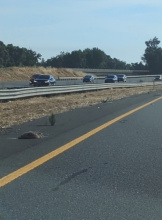 Screenshot from video - am very aware this is very bad image quality but figured sighting was worth recording anyway. Was ID'd as badger when carcass was bloated and facing other way two days ago. Located on shoulder of fast lane so it was unsafe to stop or we would have for a better picture.