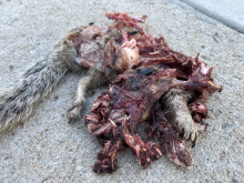Located on sidewalk, probably relocated there by the raven that was scavenging on the body