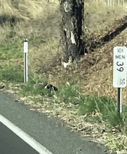 Carcass in short section of highway without barriers but flanked by divided highway (k-rail and guardrail)