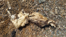mangled carcass. Mammal. No escape for the animal, steep cut banks on both sides of the highway
